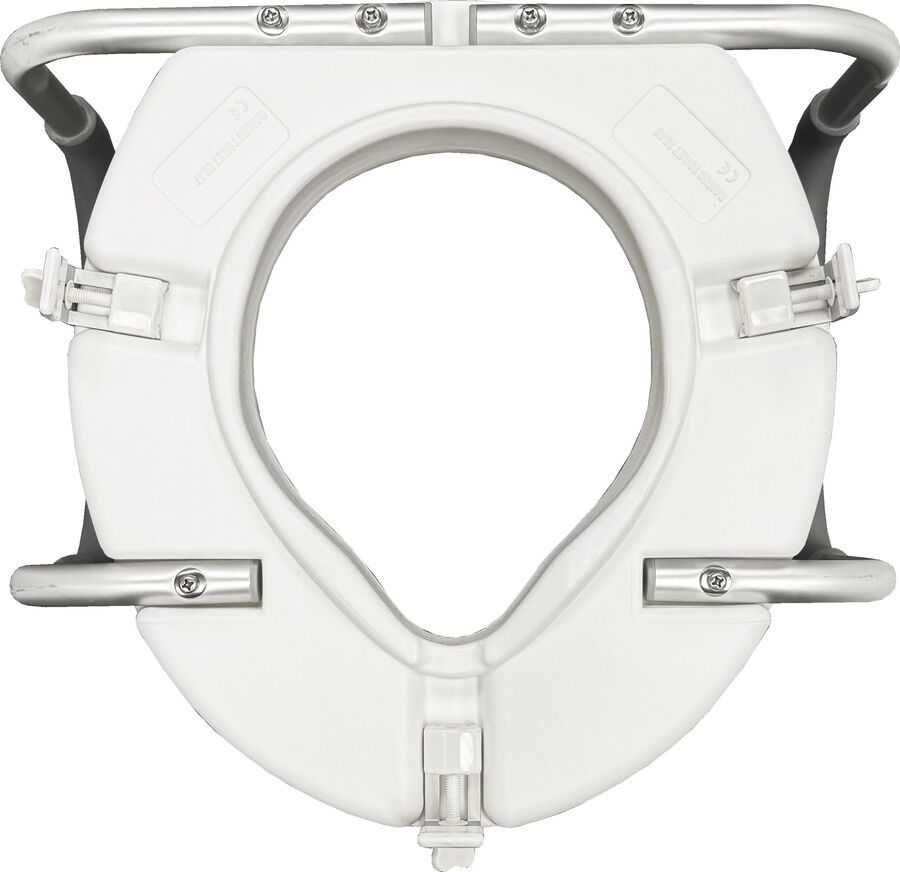 The raised toilet seat with handles is designed to assist those who need extra support when using the toilet.