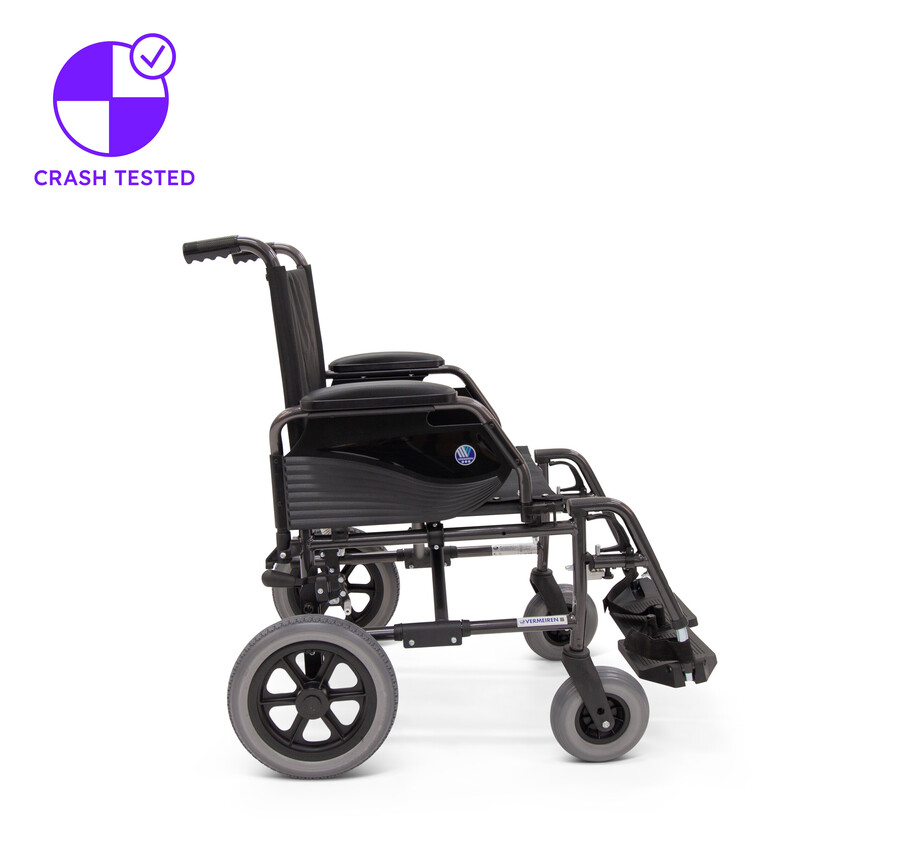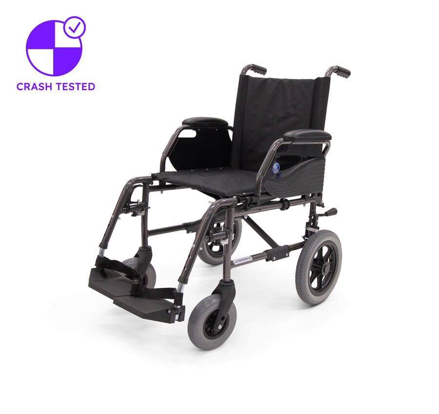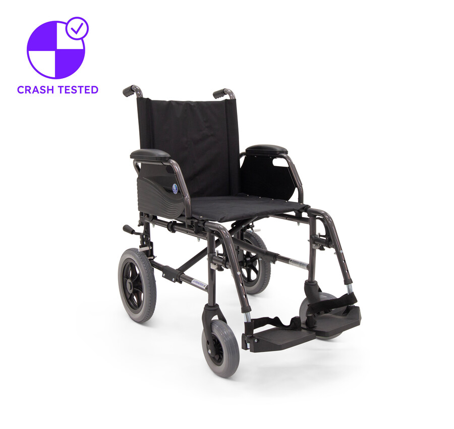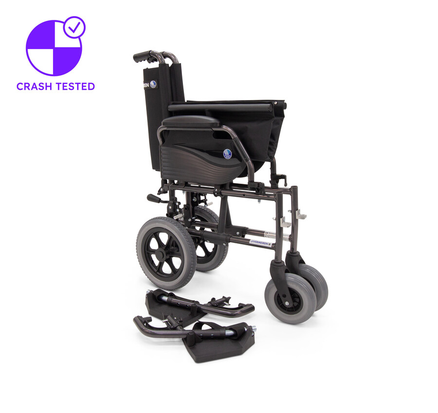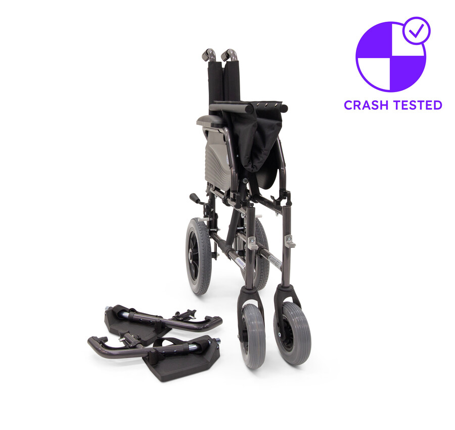 It features ergonomic handgrips, removable armrests, and adjustable leg rests for enhanced comfort. The wheelchair is lightweight, easily foldable for travel or storage, and includes swing-away footrests and foldable footplates to simplify transfers. Built to last and ISO 7176-19 compliant for safety.